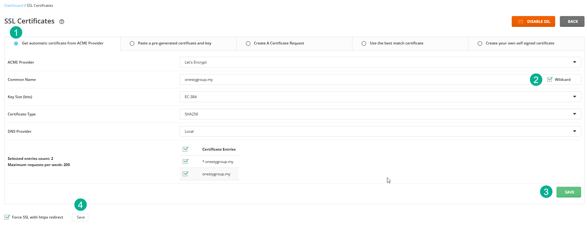 6. Tick juga pada Force SSL with https redirect dan Save sekali lagi. Lihat gambar di bawah untuk lebih faham