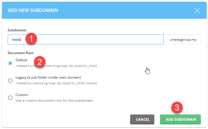 4. Masukkan nama subdomain yang anda mahu, pilih default dan klik pada button ADD SUBDOMAIN