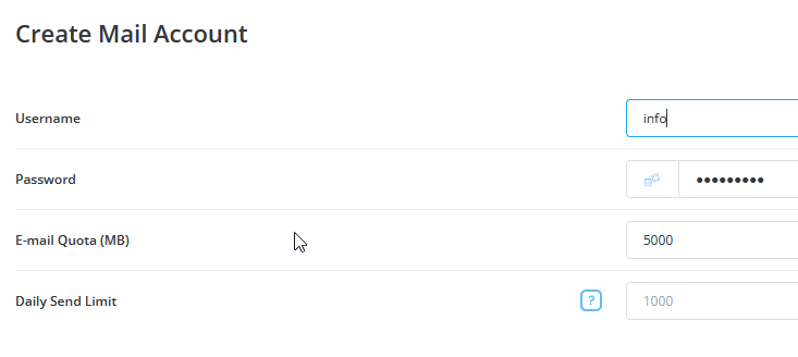 4.  Masukkan detail seperti username, password, e-mail quota (MB). Email quota adalah limit 10GB untuk setiap email. Jika anda inginkan 10GB, masukkan 10,000. Kemudian klik butang Create Account
